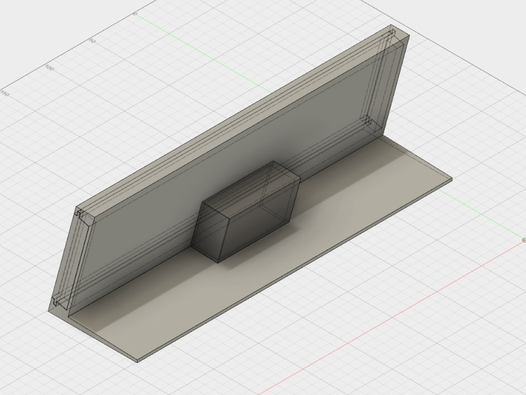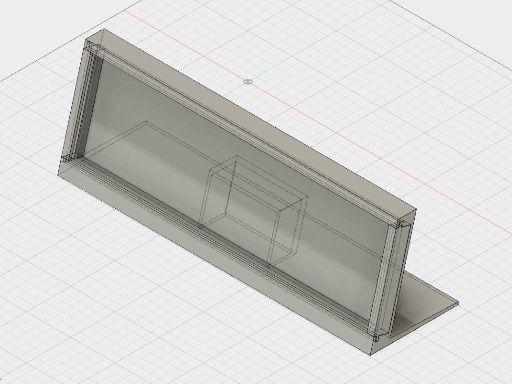 Beim ersten Entwurf habe ich grob die Optik umgesetzt die ich bei der Endversion anstrebe. Darüber hinaus habe ich darauf geachtet das die Teile leicht zu drucken sind und möglichst ohne Support auskommen. Technisch ist das bisher noch nicht all zu anspruchsvoll. Das Gehäuse besteht aus einem großen Mittelteil und zwei Seitenwänden. Die werden Links und Rechts vollständig in das Basisgehäuse eingeschoben.