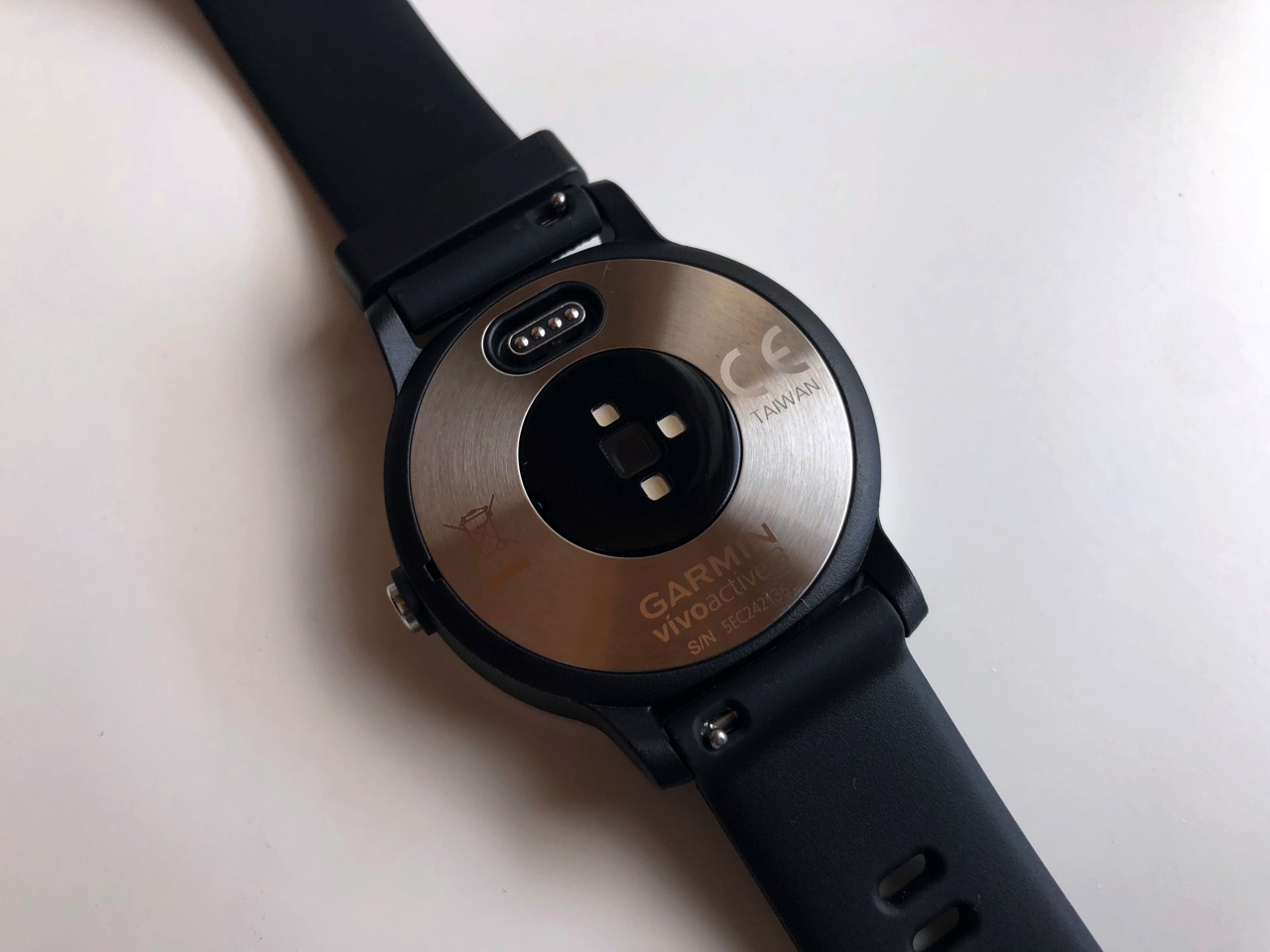 Die Vivoactive 3 macht einen gar nicht mal so schlechten Eindruck für einen Fitnesstracker. Das Gehäuse ist aus Kunststoff und tadellos verarbeitet. Das selbe gilt für die Lünette aus Edelstahl. Der Uhrenboden besteht aus einer Kombination aus Edelstahl und Glas. In ihm sind drei Sensoren und der USB-Anschluß integriert.