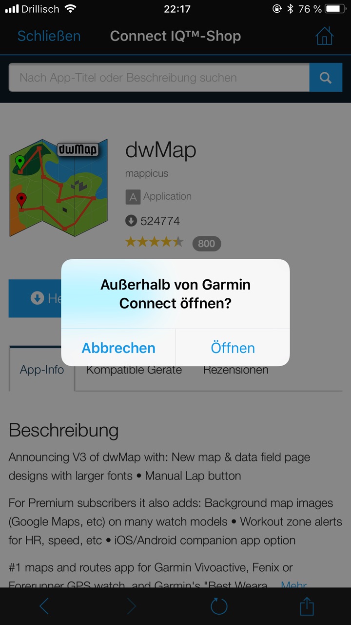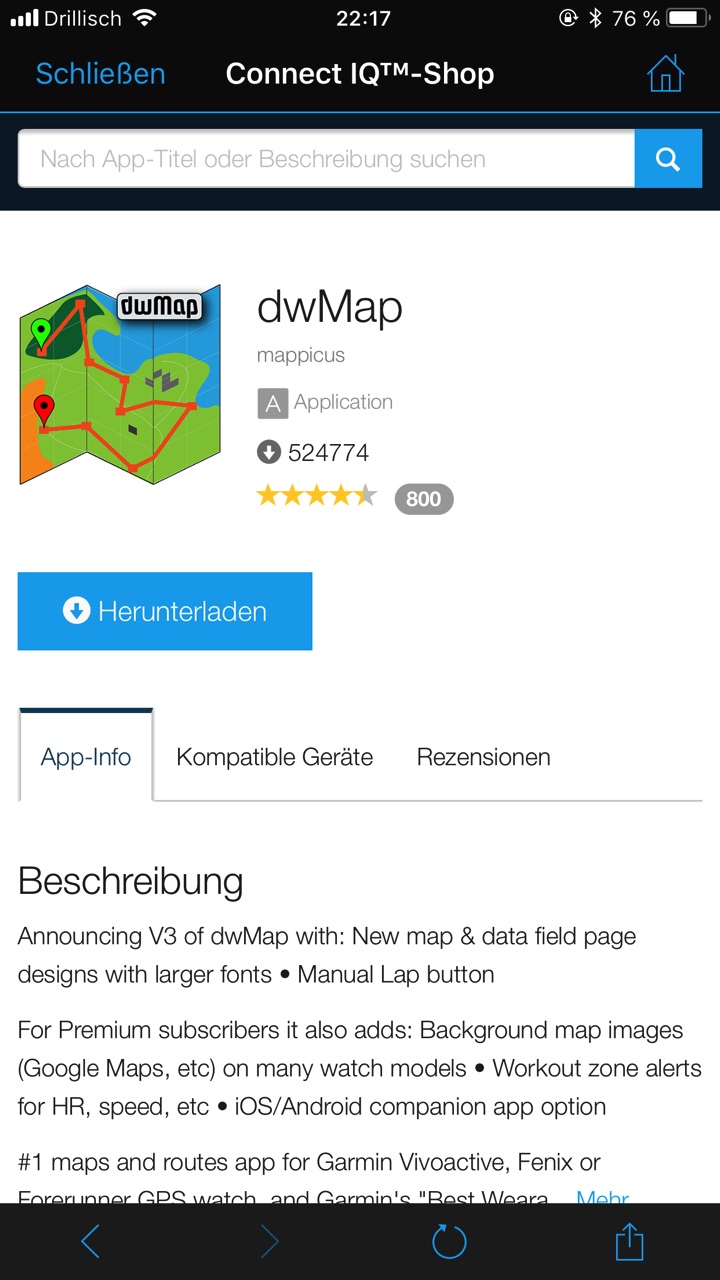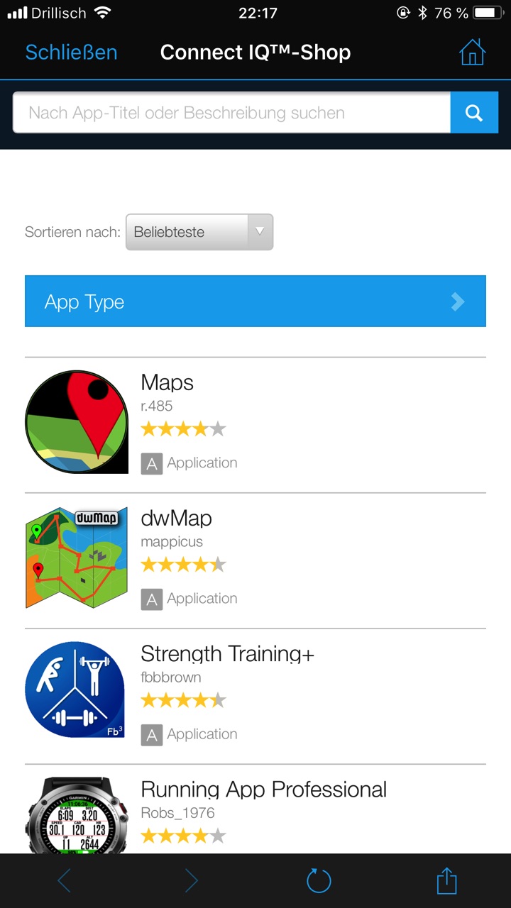 Geht man dann in das App-Management kann man sich weitere Watchfaces, Apps und Datenfelder herunterladen. Die meisten sind kostenlos, es gibt aber auch kostenpflichtige Erweiterungen.