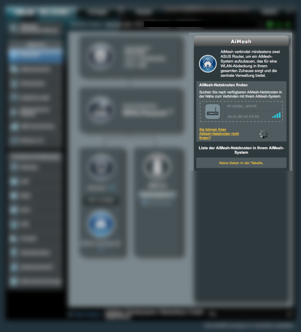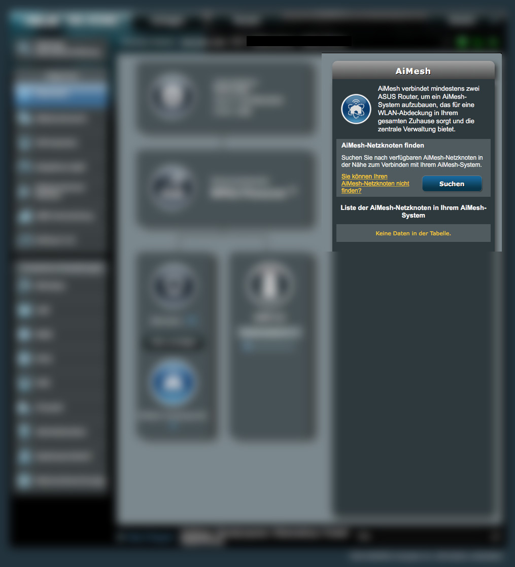 Ein Klick darauf bringt uns zur AiMesh-Anzeige und zur Möglichkeit einen Mesh-Knoten hinzuzufügen. Das geschieht, wer hätte das gedacht, mit einem Klick auf Suchen: