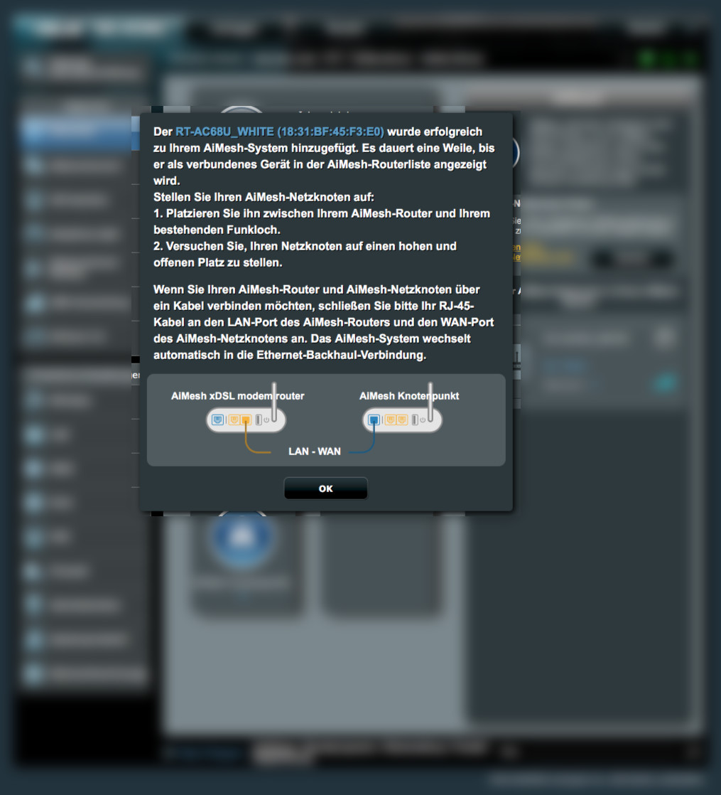 Das wars, AiMesh ist nun einsatzbereit. Nun muß man nur noch den Knoten an einer geeigneten Position aufstellen und schon kann man ein leistungsstarkes WLAN-Netz sein Eignen nennen.