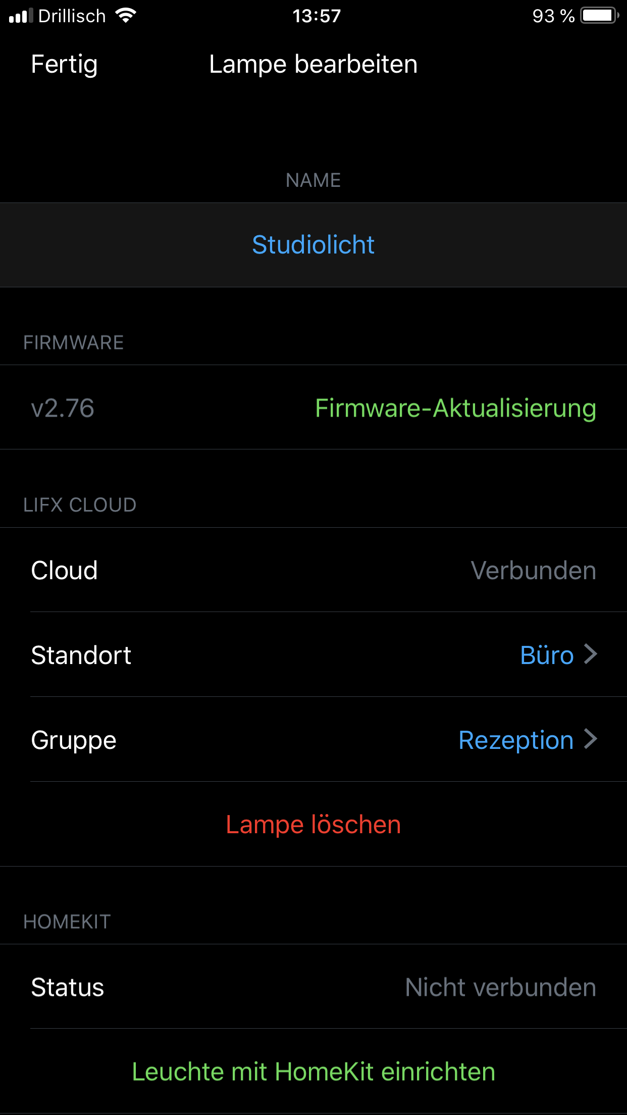 Die Unterstützung von HomeKit ist nur rudimentär umgesetzt. Mehr als ein- und ausschalten sowie die Helligkeit ändern ist nicht möglich. Man kann zwar auch gespeicherte Szenen an HomeKit übertragen, man erhält aber in dem Fall den Hinweis das nur die erste Farbe übertragen werden kann. Man kann also keine Farbverläufe an HomeKit übertragen sondern nur Vollfarben verwenden. Auch hier geht leider viel Potential verloren.