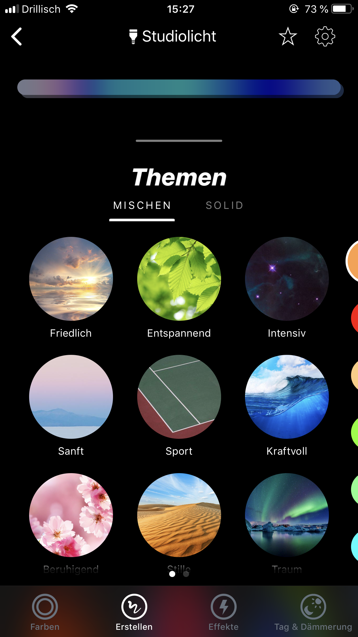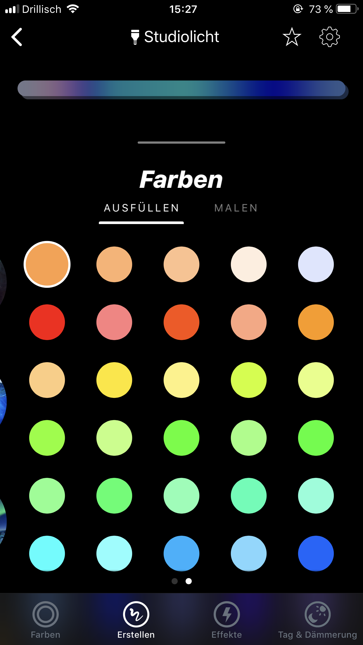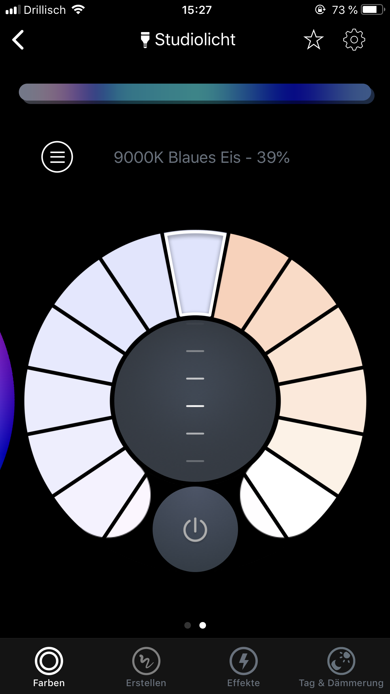 Eine Besonderheit ist das „Malen“ eines Farbschemas. Hier kann eine Farbe auswählen sie mit dem Finger auf einem Balken auftragen. Die Lightstrips werden dann analog dem Balken angesteuert. Hier kommt allerdings leider die Zonenbeschränkung zum Tragen. Man kann maximal 16 Farben (2x8 Zonen) auftragen. Weiche Übergänge zwischen den Zonen sind nicht möglich.