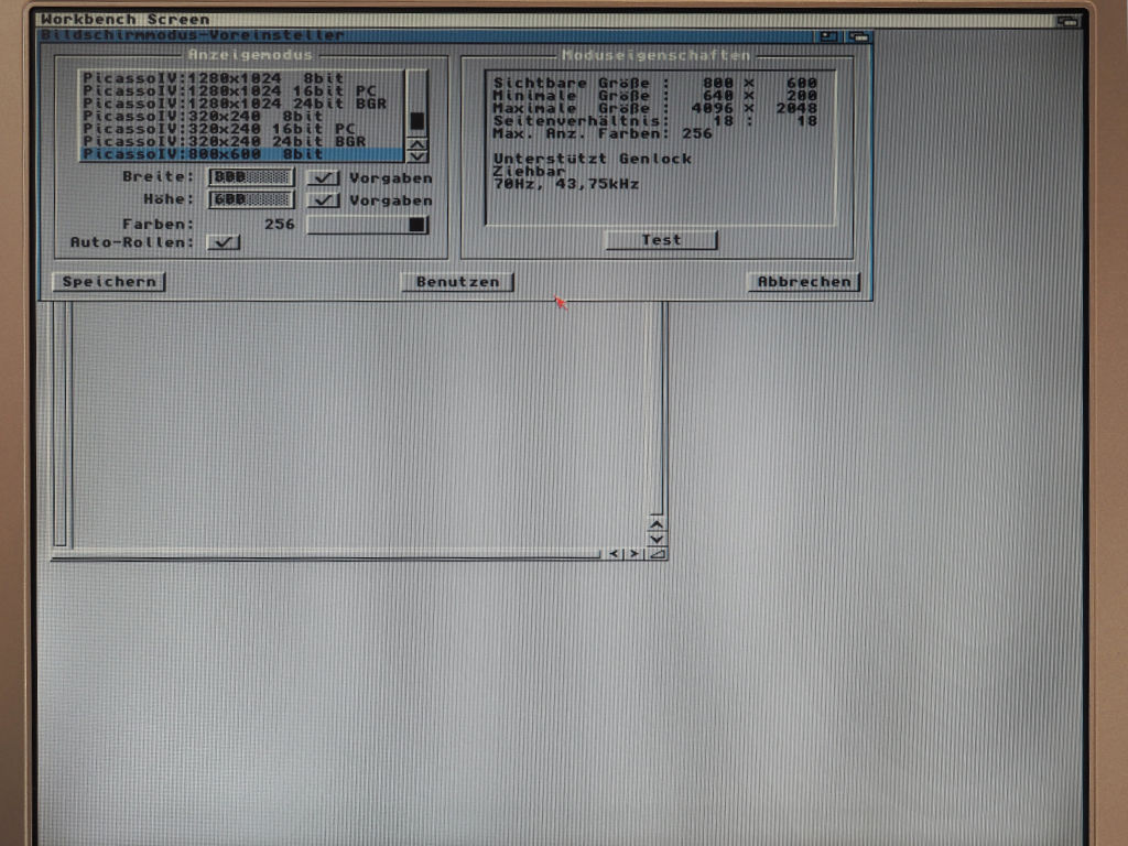 Mit der Picasso IV sind so unter anderem Auflösungen bis 1024x768 in 24 Bit Farbtiefe bei 60 Hz möglich. Mein Bildschirm hat leider eine native Auflösung von 1280x1024. Das schafft die Picasso IV leider nur mit 256 Farben in 60 Hz. Will man mehr Farben verwenden, dann rutscht die Bildwiederholfrequenz unter 60 Hz und der Bildschirm schaltet ab.