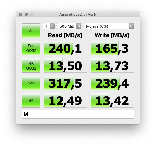 Kommen wir zum wichtigsten Punkt, was kann das Gehäuse leisten? Das Gehäuse von OWC hat mich auf ganzer Linie enttäuscht, die Übertragungsraten sind nicht wirklich als gut zu bezeichnen, darum setze ich meine Hoffnungen auf das Gehäuse hier. Aber um es kurz zu machen, auch dessen Leistung ist enttäuschend: