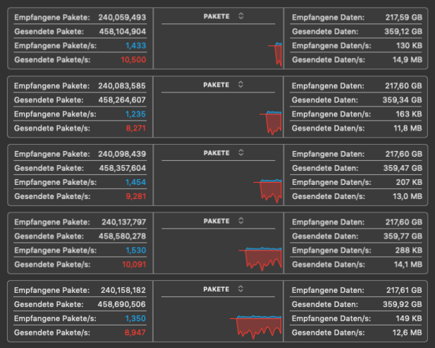 Beim Tests der Datenübertragung zwischen zwei Geräten bin ich dann recht schnell an die Grenzen des MW6 gestoßen. Es scheint so als ob Raten bis zu 80 MBit/s (10,0 MB/s) zuverlässig übertragen werden können. Alles das darüber hinaus geht ist dann nicht mehr mit stabilen Übertragungsraten machbar. Größere Dateien werden mindestens mit 80 MBit/s (10,0 MB/s) übertragen und es sind Spitzen bis zu 136 MBit/s (17,0 MB/s) möglich, meist stabilisiert sich die Übertragungsrate allerdings bei 80 MBit/s (10,0 MB/s) bis 100 MBit/s (12,5 MB/s).