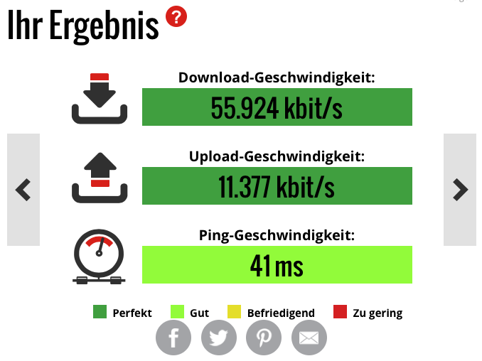 Sogar mehr als das, ich habe zum ersten mal Übertragungsraten von mehr als 50 MBit/s gesehen. Tatsächlich scheint die Bandbreite des Anschlusses zwischen 52 und 58 MBit/s zu liegen und ich habe zum ersten mal Werte über 7,0 MB/s gesehen. Bei den alten Router- / Repeater- / Mesh-Kombinationen lag ich immer knapp unter 50 MBit/s.