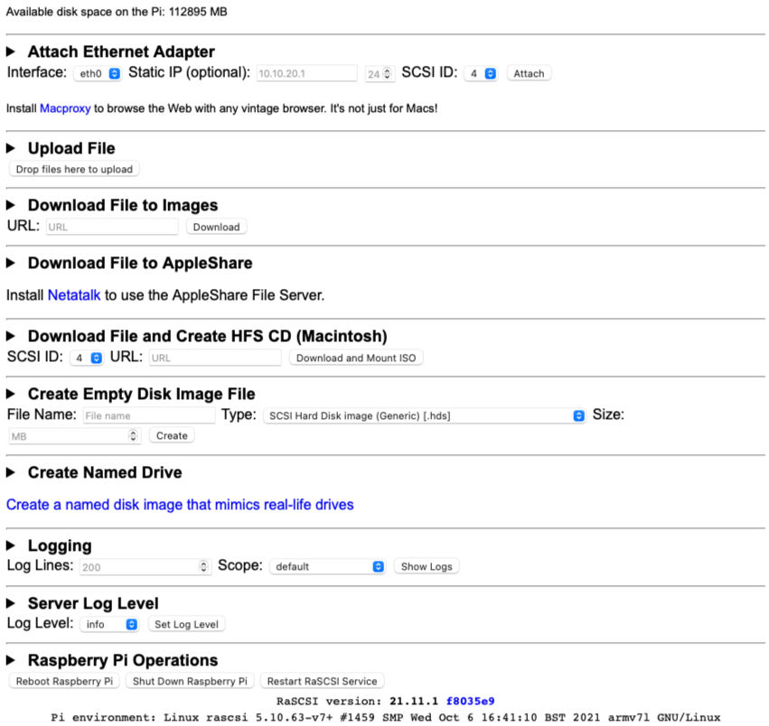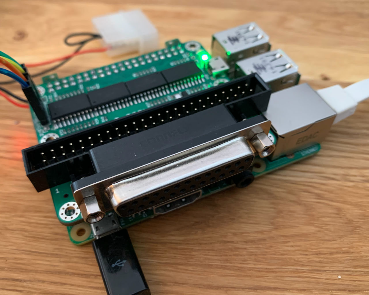 und installiert die Software auf die SD-Karte. Danach kann man das RaSCSI-Board auf den Pin-Header stecken, den Raspberry per Ethernet verkabeln und starten. Am besten schließt man den Raspberry auch gleich ans Netzwerk an und aktualisiert alle Softwarekomponenten.