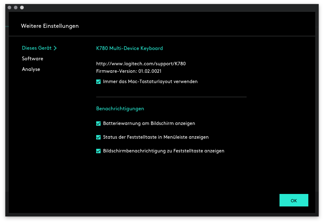 Die Einrichtung ist denkbar einfach. Da ich ja schon von der Master MX die Logitech-Software auf dem System installiert habe recht es aus, nach dem Einschalten der Tastatur, mittels der Tastenkombination fn+O der Software mitzuteilen das die Tastatur mit macOS betrieben wird. Das war es auch schon, mehr gibt es nicht zu tun.