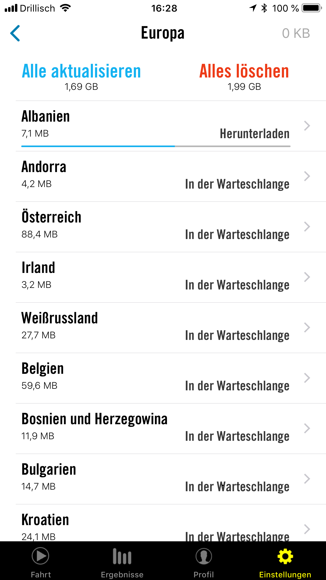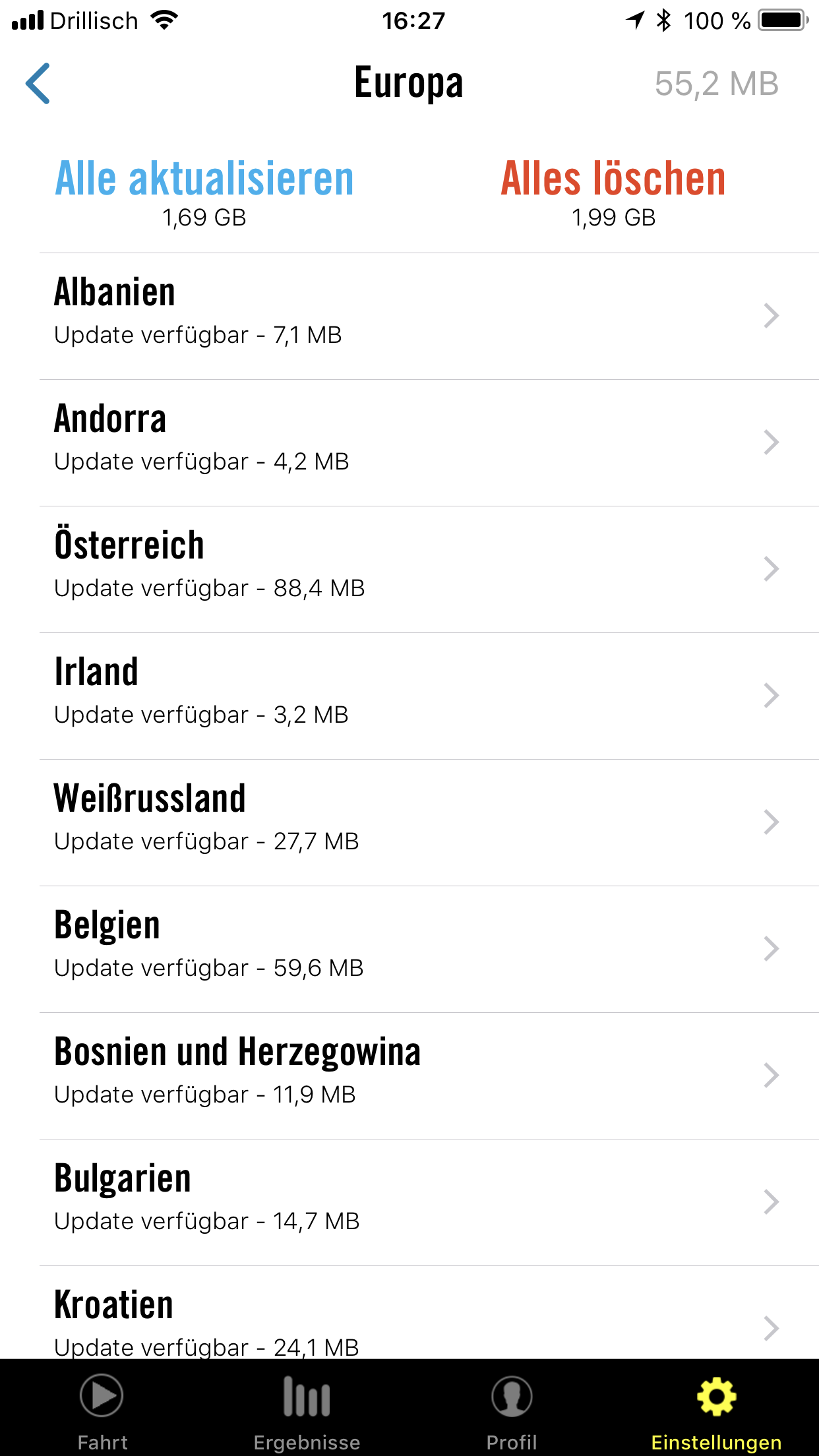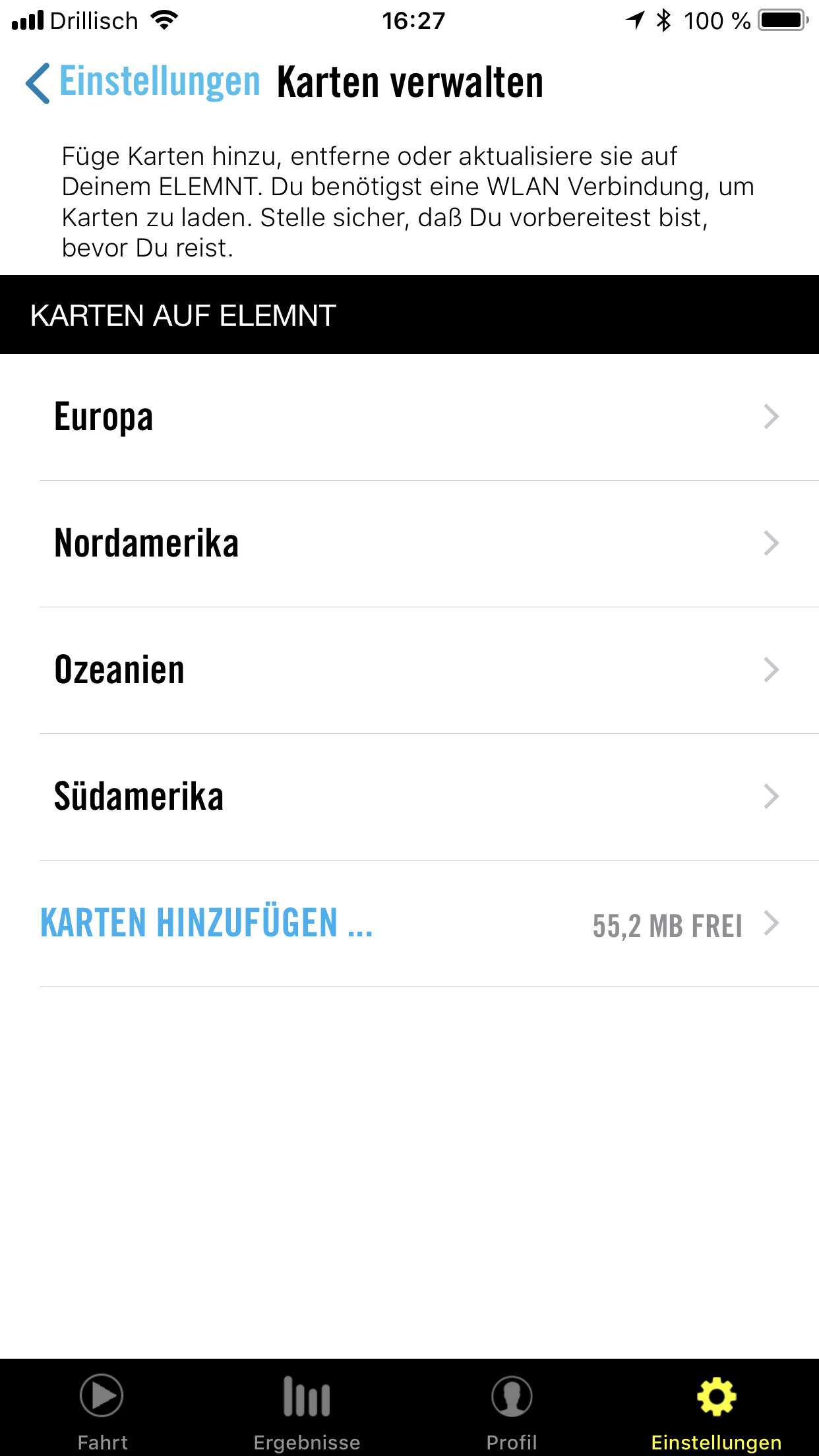 Die Kartenverwaltung zeigt einem übrigens einen großen Vorteil von Wahoo-Geräten. Man kann in der App bequem alle möglichen Regionen auswählen. Vorinstalliert sind: Europa, Noramerika, Ozeanien und Südamerika. Alleine der Eintrag Europo weist 50 Unterkarten auf. Insgesamt sind rund 5,5 GB Karten installiert. Diese werden regelmäßig aktualisiert und sind kostenlos im Gerätepreis enthalten. Beim Garmin sind die Karten kostenpflichtig, so kostet die Europakarte zum Beispiel rund 70 EUR. Alternativ kann man sich zwar über Drittanbieter kostenlose Openstreetmap-Karten besorgen, aber die Handhabung in der Wahoo-App ist eine wahnsinnige Erleichterung im Umgang mit Karten.