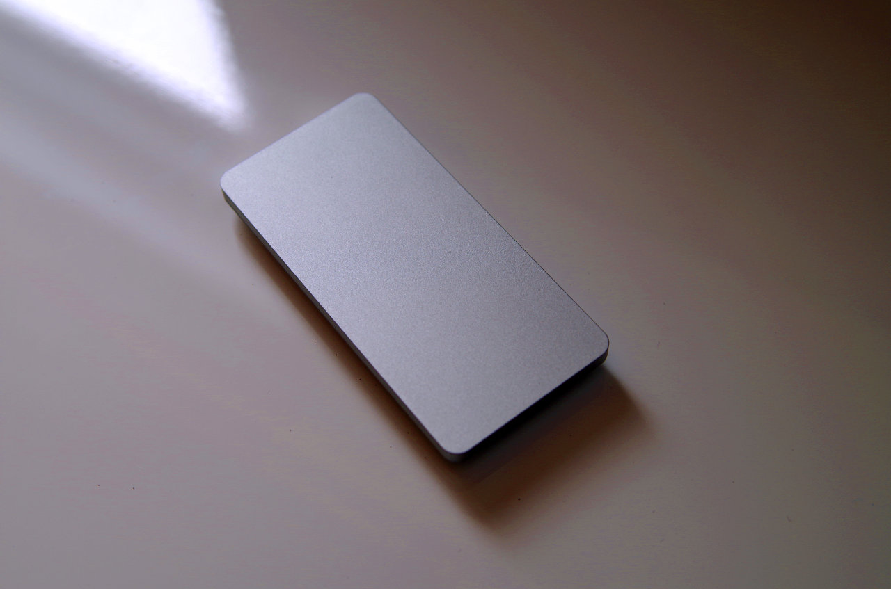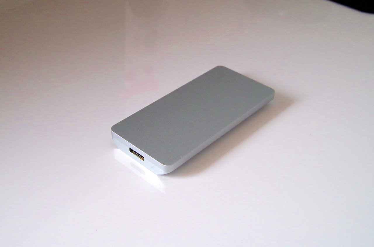 Da es sich um ein eloxiertes Aluminiumgehäuse handelt macht die Oberfläche qualitativ erst mal einen hochwertigen Eindruck. Allerdings weist das Gehäuse an den Unterseite eine sehr starke Fase auf. Dadurch wird versucht das Gehäuse schmal und schwebend aussehen zu lassen. Das gelingt zwar auch aber mir persönlich gefällt die Form gar nicht. Ich hätte an der Stelle eine normale Quaderform mit leichter Fase oder Abrundung bevorzugt. Die Zugriffe auf das Laufwerk werden in Form einer weißen, großen Leuchtanzeige an der kleinen Vorderseite dargestellt.