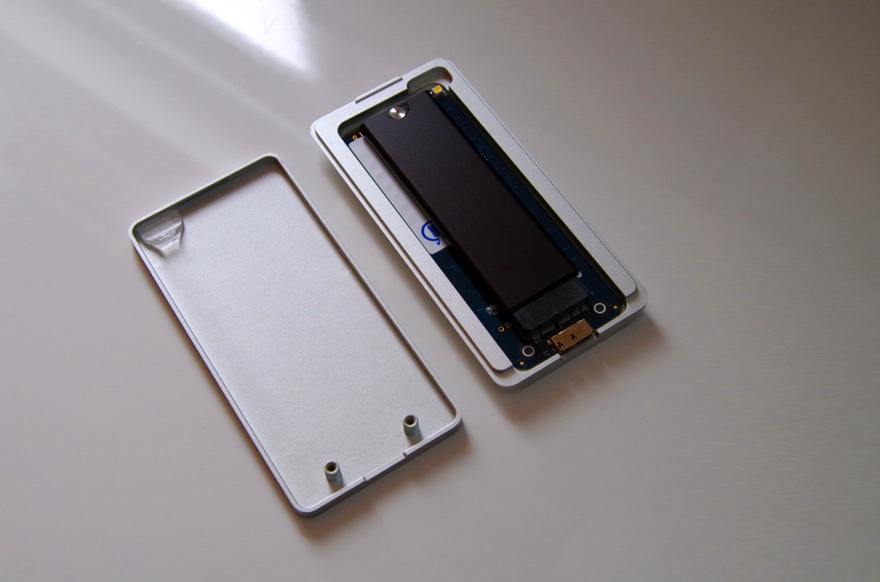 Hier gibt es nicht viel zu beachten. Man steckt die SSD in den Port und fixiert sie mit einer Schraube. Anschließend setzt man beide Gehäuseteile zusammen und schraubt auch diese mit zwei Schrauben zusammen. Dann klebt man noch den Gummistreifen an den vorgesehenen Platz und schon ist man fertig. Nun kann man das externe Laufwerk mit dem USB-Kabel am Mac anschließen.